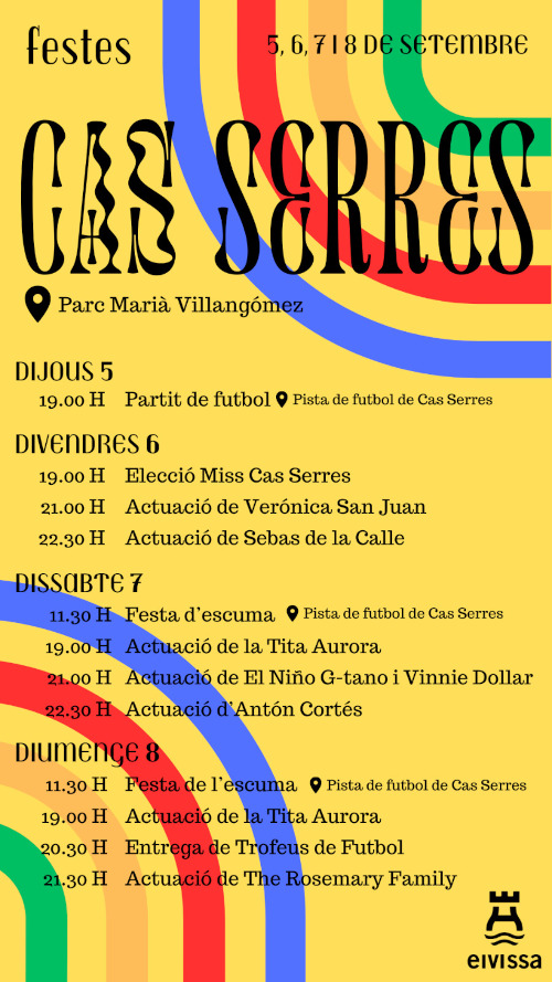 El barrio de Cas Serres celebra sus fiestas y su Asociación de Vecinos junto con el Ayuntamiento de Eivissa han organizado de día 5 a día 8 de septiembre diversas actividades de todo tipo pensadas para todos los públicos. La mayoría de actividades se celebrarán en el Parque Marià Villangómez, excepto las fiestas de espuma que se realizarán en la pista de fútbol de Cas Serres.